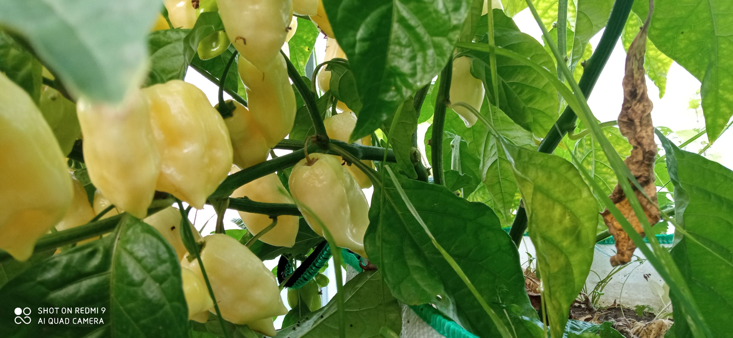 Красивая и довольно редкая разновидность Capsicum chinense — 7 Pot White с о. Тринидат!!! Острота более 1 млн. по шкале Сковилла. Растение до 70 см в высоту. Для выращивания в теплицах и парниках, в домашних условиях можно выращивать в горшке от 5-ти литров (как многолетник). Зрелые плоды цвета слоновой кости, обильно покрывают «деревце», сорт очень урожайный. Стручки гладкие, по форме больше напоминающие хабанеро. У части стручков может присутствовать короткое жало. Вкус хрустящих перчиков сладкий, фруктовый, с нотками сельдерея. Перчики прекрасно сушатся, из них получают очень пикантную и ароматную приправу для соусов, мясных и овощных блюд.