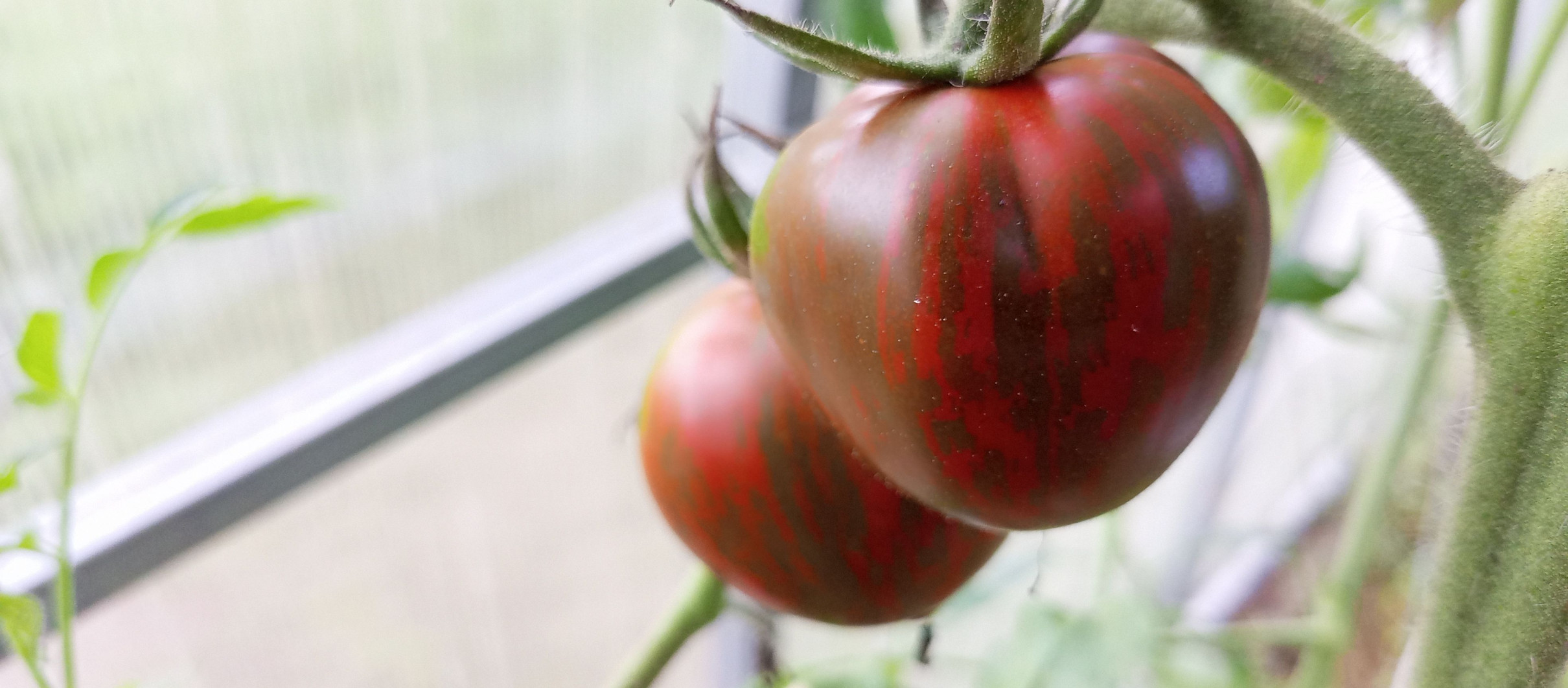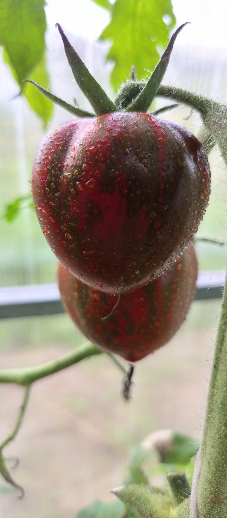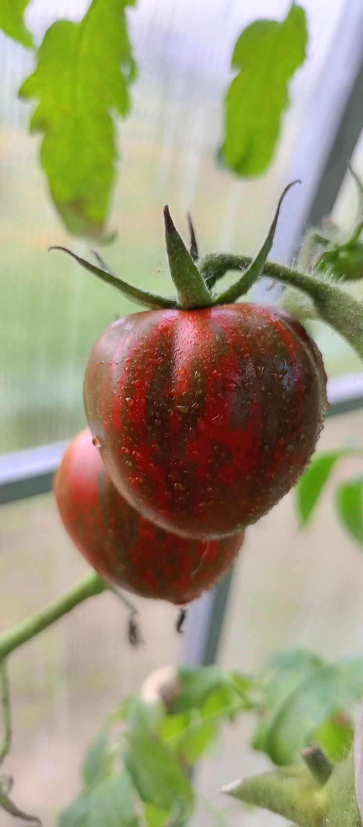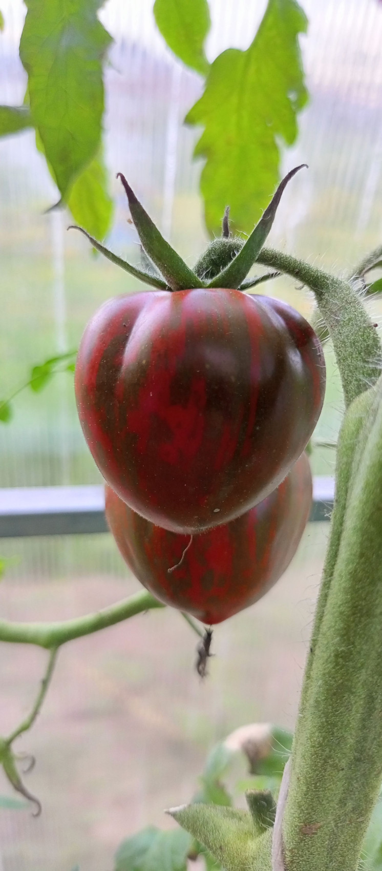 Высокорослый куст украшают плоды невероятной красоты – розовые, с болотно-серыми штрихами и полосками. Смотрится очень красиво. Высокая урожайность. Насыщенный, богатый вкус. Среднеспелый. Вес плодов 70–150 грамм. Применение универсальное.