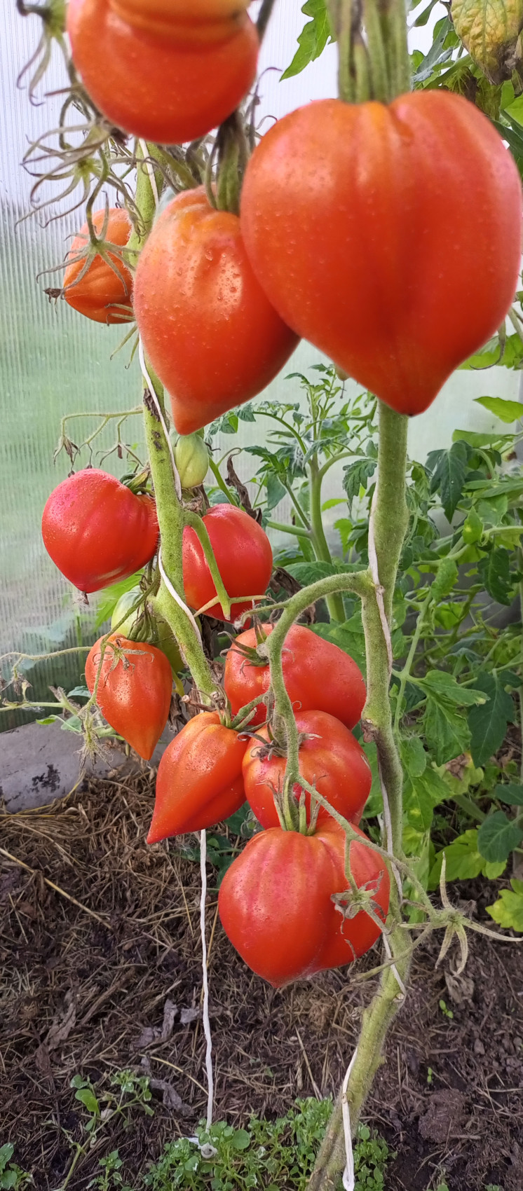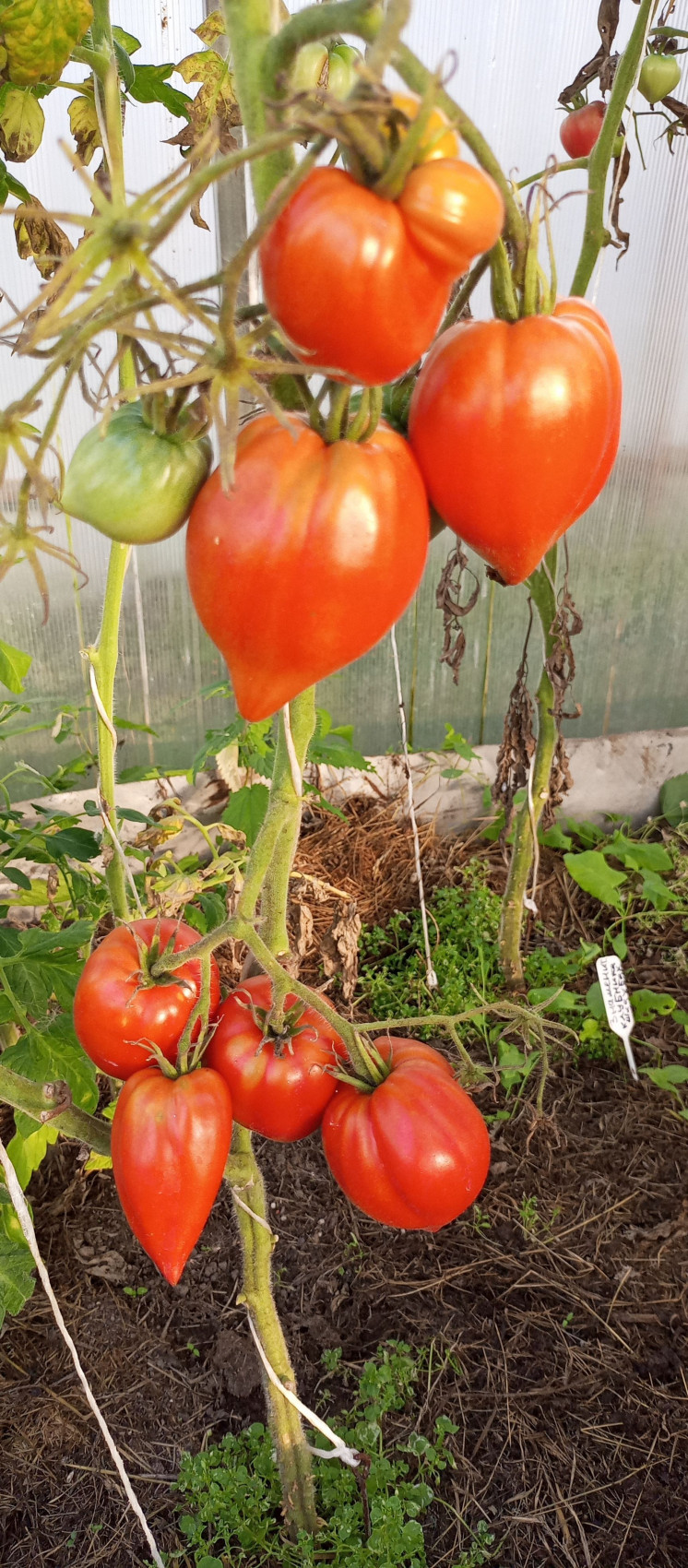 Куст высотой до 200 см. Тип роста — индетерминантный. В кисти образуется 5–7 помидоров. На кусте может быть от 6 до 8 кистей. Подходит для открытого грунта и теплиц. Плоды крупного размера, весом от 300 г, но могут достигать массы более 1 кг. Имеют сердцевидную форму с острым кончиком, слегка ребристые, малиново-алой окраски. Мякоть нежная, мясистая, сахаристая на разрезе. Кожица тонкая, семян мало. Имеют высокий товарный вид. Хорошо перевозятся и хранятся около 2 недель в холодильнике или сухом прохладном месте. Сорт среднеспелый, высокоурожайный.